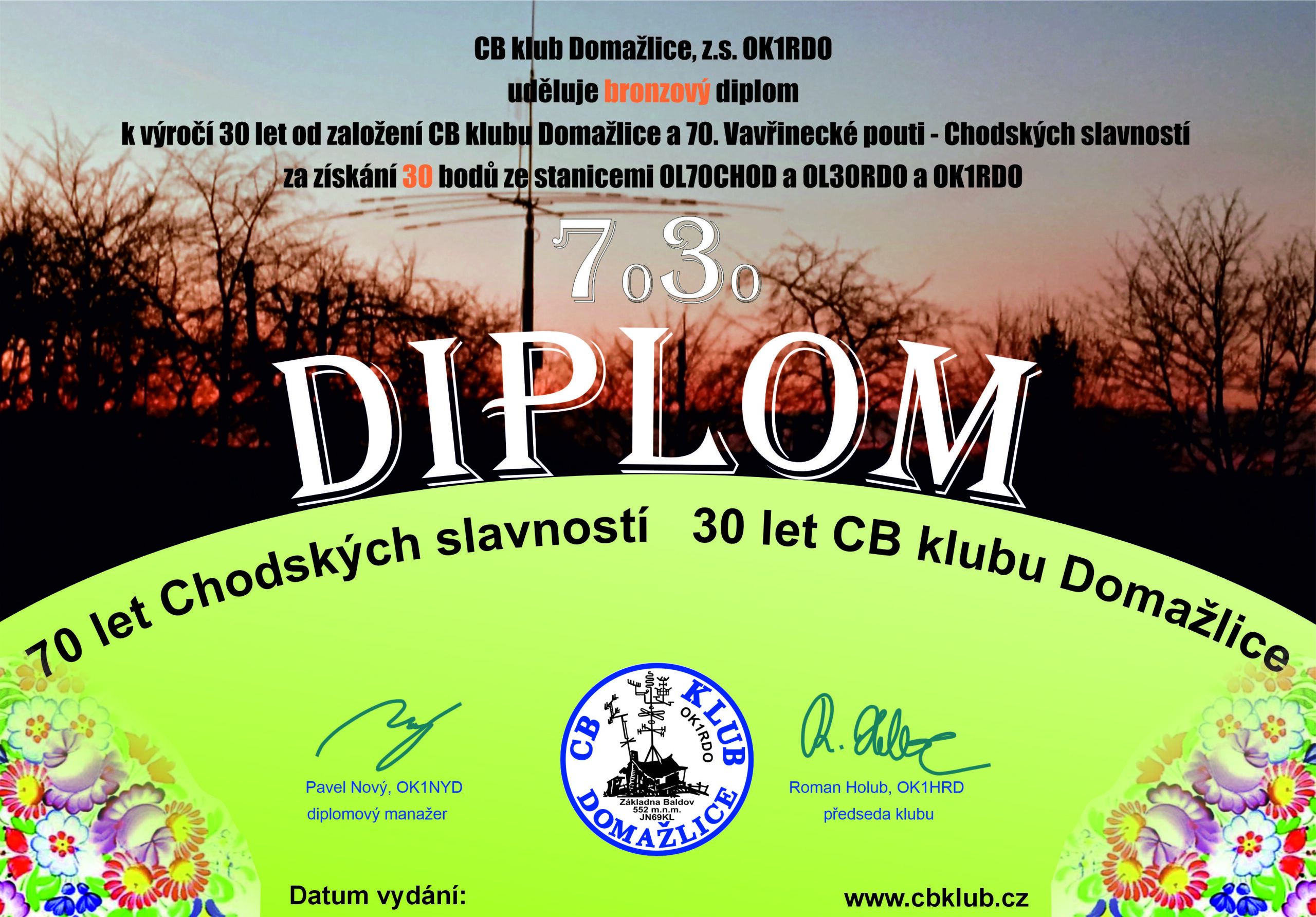 CB klub Domažlice navazuje na radioamatérský diplom “70/30”, k oslavě třiceti roků od založení CB klubu a sedmdesáti letům konání Vavřinecké pouti – Chodských slavností, také CB/PMR aktivitou.